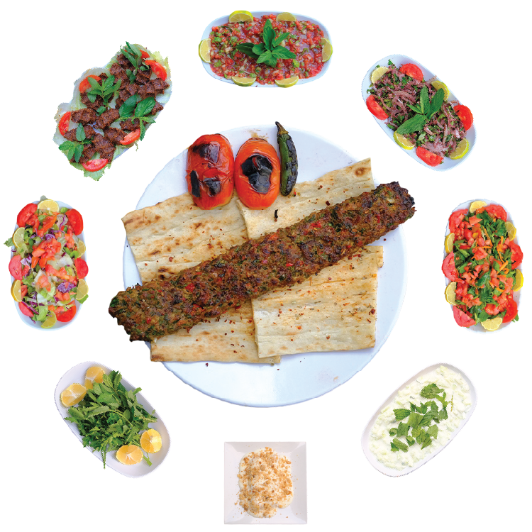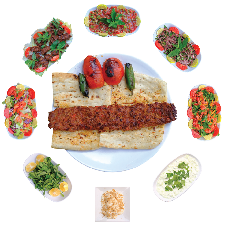 150 gr. Adana kebap. Soğan salatası, mevsim salata, roka salatası, ezme, cacık, yeşillik, limon, közlenmiş domates, biber ile