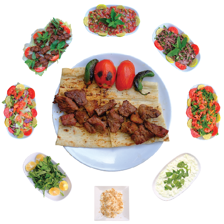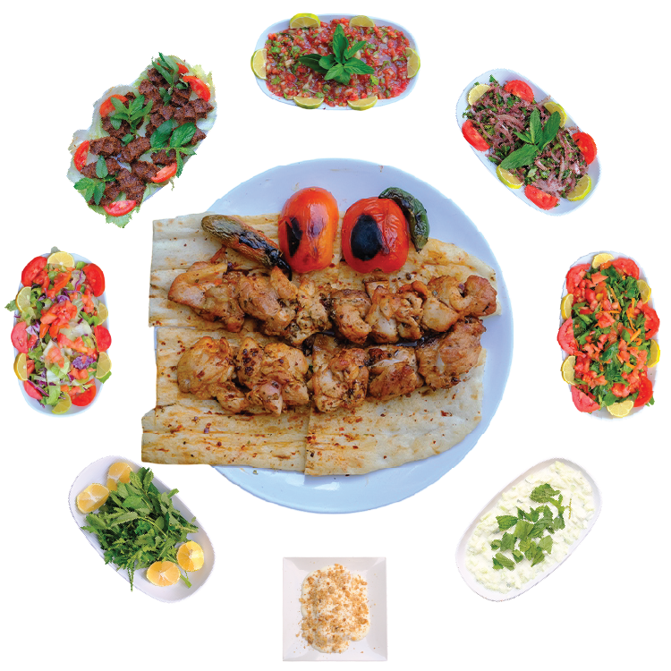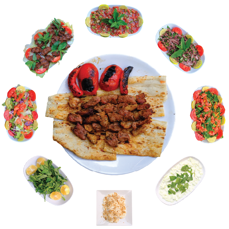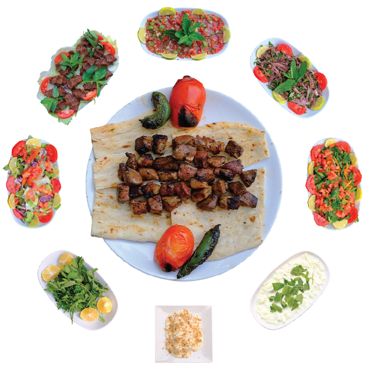 Soğan salatası, mevsim salata, roka salatası, ezme, cacık, yeşillik, limon, közlenmiş domates, biber ile