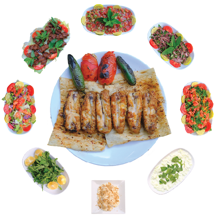 Adana, tavuk şiş, çöp şiş, kanat, ciğer vs…