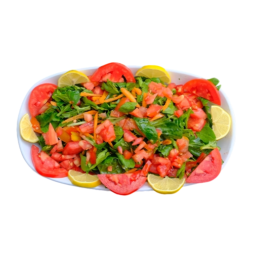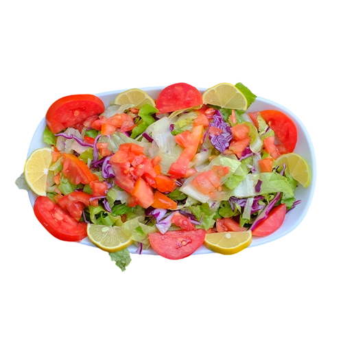 Marul, kıvırcık, mor lahana, havuç, domates, salatalık, limon, zeytinyağı, tuz ile servis edilir.