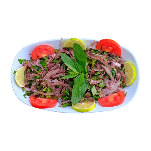 (Açık) Soğan salatası, mevsim salata, roka salatası, ezme salatası, cacık, közlenmiş biber, domates, yeşillik, limon ile