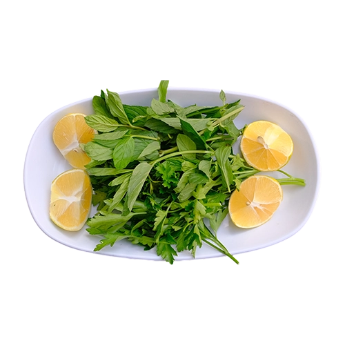 Maydanoz, nane, roka, tere, limon dilimleri.